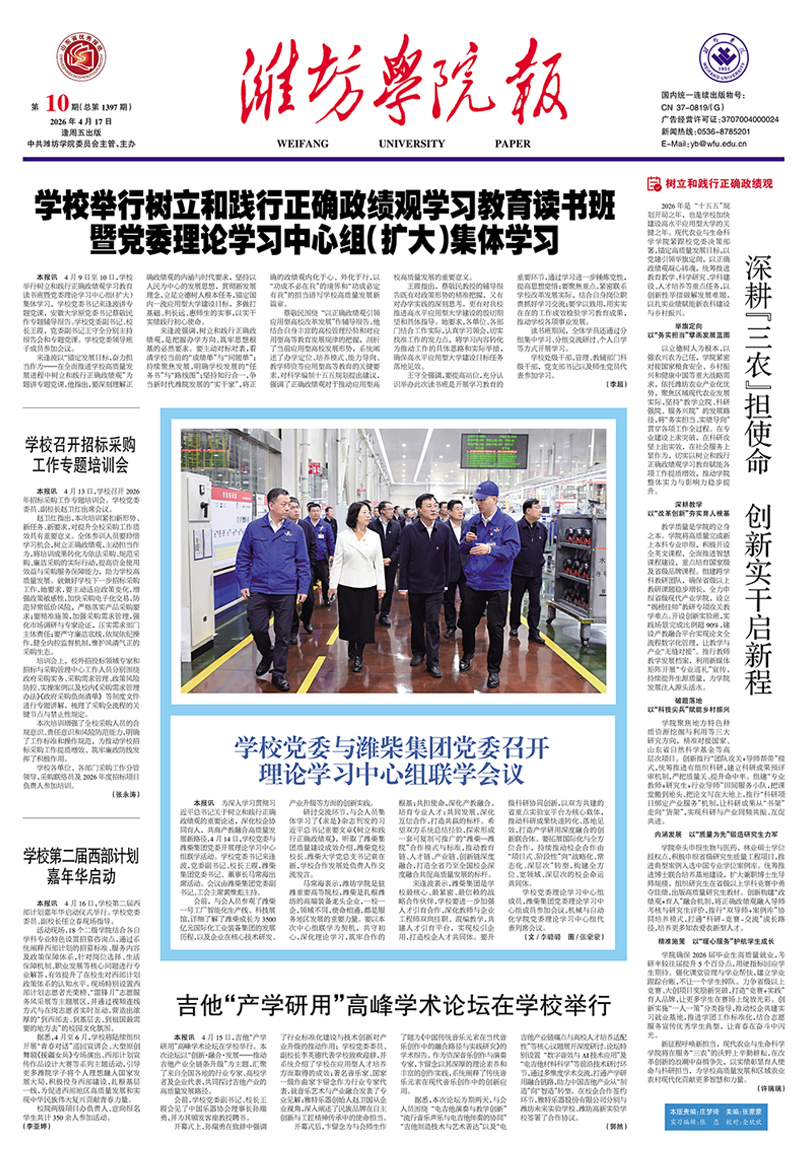 本网讯 为深入学习贯彻习近平总书记关于树立和践行正确政绩观的重要论述,深化校企协同育人,共商产教融合高质量发展新路径,4月14日下午,学校党委与潍柴集团党委开展理论学习中心组联学活动。学校党...