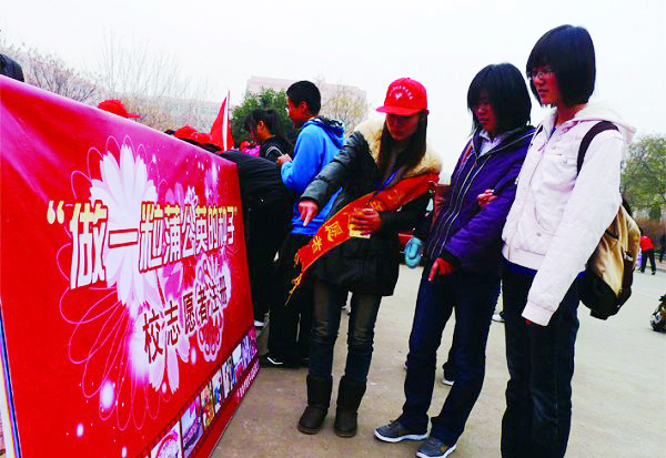 近年来,我校大学生志愿者队伍不断发展壮大,注册青年志愿者数已超过8千人。12月5日中午,由团委主办、校青年志愿者联合会承办的志愿者招募及集中注册活动在学校二餐前广场举行,校青志联、各学院志愿服务队、校级志愿服务类学生社团的百余名志愿者参加了活动。本次活动以“做一粒蒲公英种子”为主题,号召广大在校学生积极投身志愿服务行列,共同创建和谐文明的校园文化。活动现场还面向2011级新生进行为期三天的志愿者招募和注册活动,工作人员通过用知识讲解、展板展示等方式向同学们宣传志愿服务理念、介绍我校志愿者组织、号召大家积极投身志愿服务活动。本次招募结束后,我校注册青年志愿者人数将进一步提升。