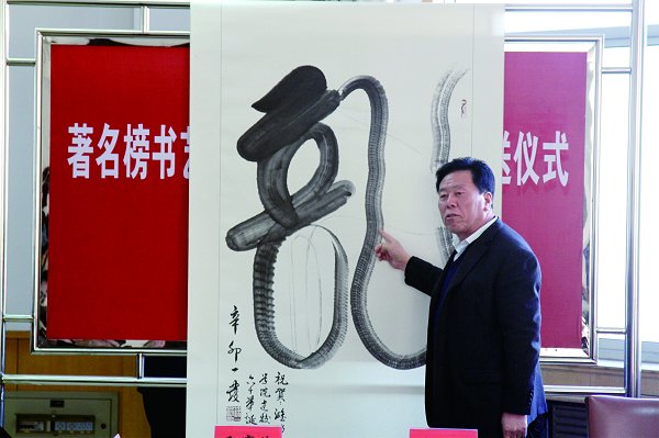 本站讯:12月22日,著名榜书艺术家徐一发将自己的书写作品“龙”,作为校庆六十周年的礼物捐赠给我校收藏。院长王守伦出席捐赠仪式并为其颁发了捐赠证书。党委副书记牛钟顺主持捐赠仪式。