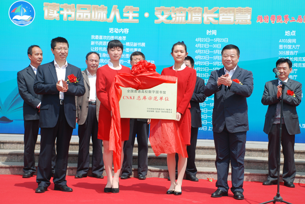 开幕式上,中国知网高教副总经理赵景海与辛丕宏共同为“全国普通高校数字图书馆CNKI总库示范单位”揭牌。潍坊市档案局局长王保民、潍坊市鸢都收藏沙龙主席刘广顺为“记忆潍坊———徐靖国个人收藏展”揭牌。