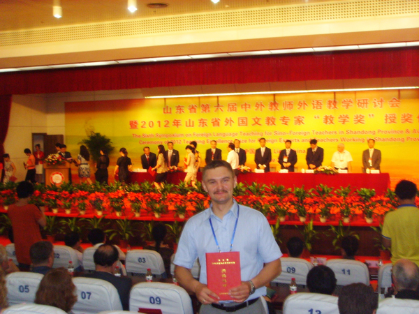 本站讯 2012年6月16日至18日,山东省第六届中外教师外语教学研讨会暨2012年山东省外国文教专家“教学奖”授奖仪式在临沂大学沂蒙大讲堂举行。我校乌克兰籍外教尤金(Shmatko Yevgen)作为获奖外国专家出席并受奖。