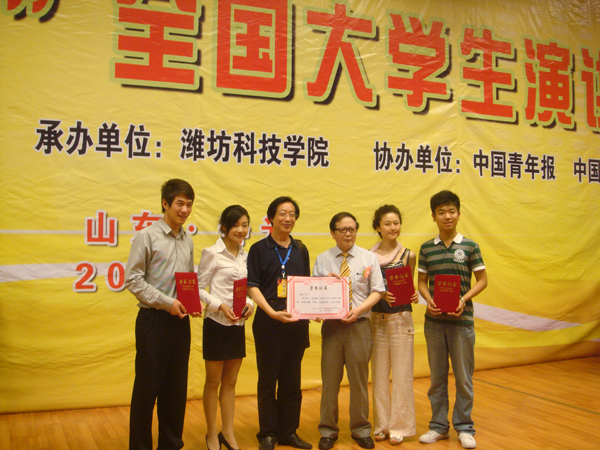 本站讯 日前,道德的力量——2012“寿光杯”全国大学生演讲大赛在潍坊科技学院举行。我校代表队在大赛中荣获团体一等奖。我校播音主持专业学生曲涛凤、白云、宗红三名选手杀入总决赛,并获二等奖,崔璨、何旭东获三等奖;崔璨荣获即兴演讲比赛一等奖。