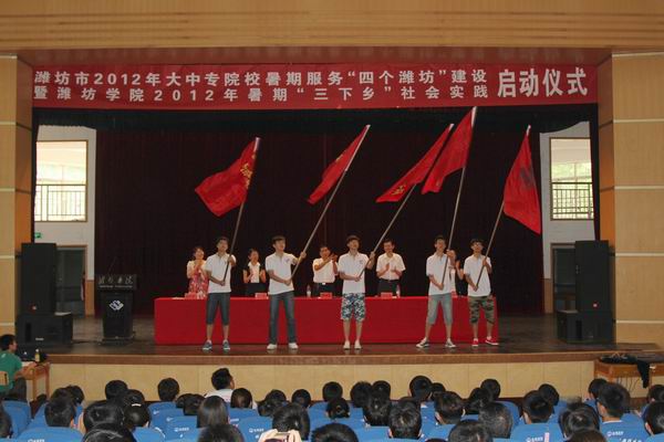 本站讯 7月3日,潍坊市2012年大中专院校暑期服务“四个潍坊”建设暨潍坊学院2012年暑期“三下乡”社会实践启动仪式举行。副院长邢同学、团市委副书记李志为出席仪式并向社会实践团队授旗。来自驻潍大中专院校的近三百名实践团队成员参加了出征仪式。