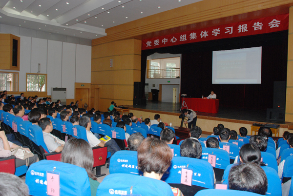 本站讯 9月13日,学校党委理论中心组(扩大)举行报告会,集体学习了胡锦涛同志在省部级主要领导干部专题研讨班上的重要讲话精神。党委书记辛丕宏主持报告会,他要求进一步统一思想认识,密切联系实际,推动当前工作。本次学习采取集中观看辅导录像的方法,观看了中央党校