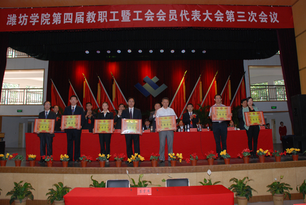 在下午举行的全体大会上,表彰了获得市级及以上荣誉的先进集体、先进个人和学校2011至2012学年度先进集体、优秀教师与先进工作者;王守伦代表学校与中层单位代表签订了目标任务书;审议并通过了《关于〈院长工作报告>的决议》、《关于<潍坊学院教职工代表大会实施细则>的决议》、《关于〈工会工作报告>的决议》、《关于〈学校财务工作报告>的决议》。根据新通过的《潍坊学院教职工代表大会实施细则》,今后“双代会”由三年一届改为五年一届。