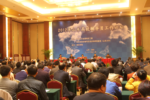 本站讯 10月30日至31日,由中共山东省委高校工委与教育部高校辅导员培训和研修基地(山东大学)联合主办、我校承办的2012年山东高校辅导员工作论坛在富华大酒店举行。山东省委高校工委副书记黄琦,学校党委书记辛丕宏、院长王守伦、副院长邢同学出席论坛。论坛由山东省委高校工委宣教处处长刘欣堂主持。全省高校学生工作部门负责人、优秀论文作者及辅导员代表200余人参加了论坛。