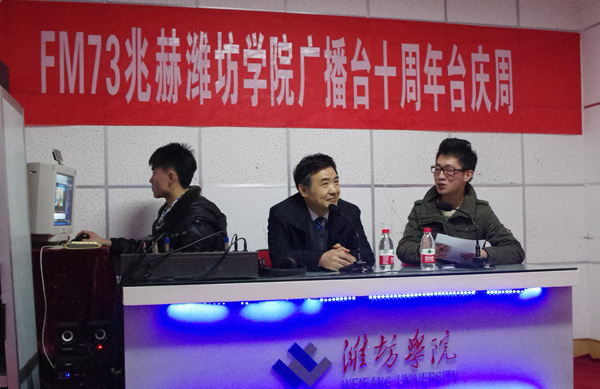 王院长做客直播间,与主持人互动交流。他说,广播台为校园增添了浓厚的文化氛围、热烈的气氛,既宣传了学校的大事,同时也为广大师生带来了欢乐。他指出,党的十八大提出把国家建设成富强、文明的社会主义现代化国家的目标给全党及全国各族人民很大的鼓舞和激励,作为高校,我们要始终坚持教学立校、人才强校、特色名校的战略,提高学校的内涵式发展,提高教学质量,优化培养模式,进一步理清学校服务社会的职能,为社会的经济和发展做出应有的贡献。他希望广播台努力按照十八大的要求,把十八大精神变成一种听众喜闻乐见的形式,传达给教师和学生,使他们在听广播的过程中,受到感染,潜移默化地把十八大的精神注入到师生的头脑当中,从而变成师生指导今后行动的指针和力量。并希望大家要积极宣传党的方针政策,为校园社会工作发挥特长,在不断丰富校园生活方面,更好的贴近、反映广大师生员工的要求和心声,做好学校建设和发展的拉拉队。