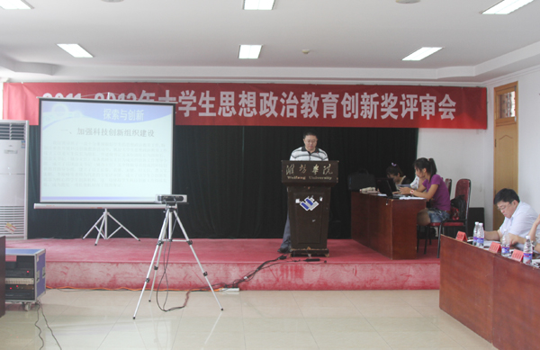评审会上,来自16个二级学院的参评人员分别以PPT演示形式进行了汇报答辩。计算机工程学院申报的《构建学生学风建设长效机制》、外国语学院申报的《学生会“三自”服务管理模式探索》、建筑工程学院申报的《塑榜样带动优秀学风学先进实现美好梦想———“榜样·建工”优秀大学生评选榜样教育活动》、美术学院申报的 《在实践中引领大学生实现德育与美育完美统和》、物理与光电工程学院申报的《“曲金民未来之星”奖学金评选答辩会》、生物与农业工程学院申报的《深造促学风,创新展宏图》等创新项目。