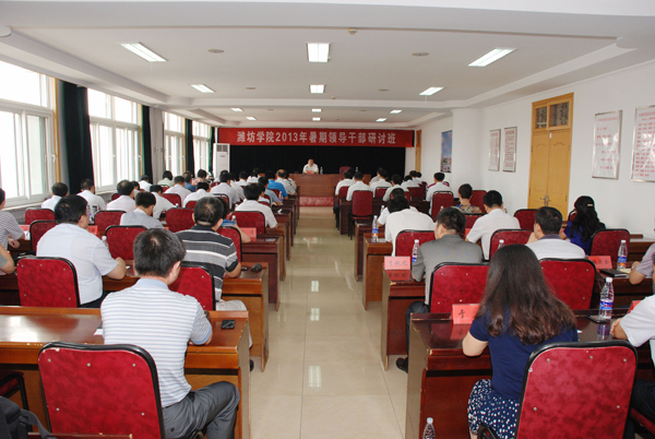 本站讯 8月26日至29日,学校举行2013年暑期领导干部研讨班。根据学校党的群众路线教育实践活动的暑假安排,干部们前往潍坊烈士陵园重温了入党誓词,参观了潍坊市规划设计馆和滨海经济技术开发区,集中交流了学习体会和新学年工作打算。党委书记辛丕宏主持研讨交流会并作重要讲话。省委督导组组长黄琦、省委督导组成员史培亮出席28日上午的研讨,听取了学校领导的大会发言。学校领导王守伦、牛钟顺、冯滨鲁、王清明、丁子信、马茜华出席了研讨班各项活动。47个中层单位、部门的负责同志参加了研讨班。