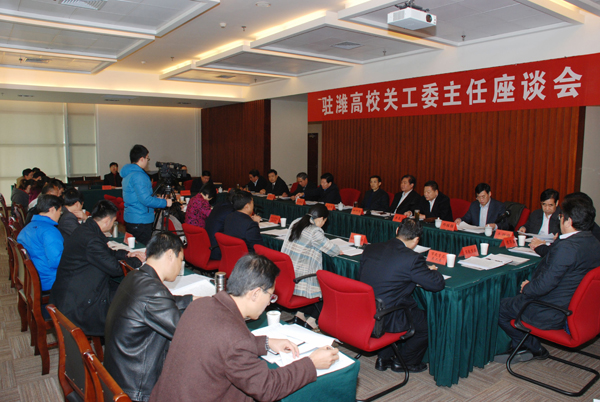 本站讯 11月26日,驻潍高校关工委主任座谈会在我校体育馆会议室举行。省高校工委副书记傅华峰,市关工委主任赵兴涛、市委秘书长刘德成出席座谈会并讲话,党委书记辛丕宏在会上致辞,院长王守伦出席座谈会,党委副书记牛钟顺作交流发言。座谈会由市关工委副主任王永兴主持。