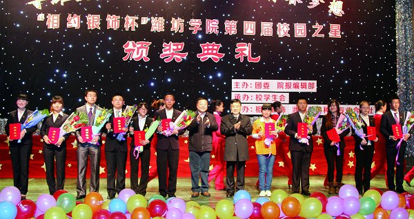 本站讯 12月23日,由团委、院报编辑部联合主办的“寻潍院最美学子,筑中国青春梦想”———“相约银饰杯”潍坊学院第四届校园之星颁奖典礼在图书馆报告厅隆重举行。学校领导辛丕宏、王守伦、牛钟顺、冯滨鲁、马茜华出席颁奖典礼。我校各学院、各部门的负责同志和应邀来到现场的老师同学们观看了整场晚会。