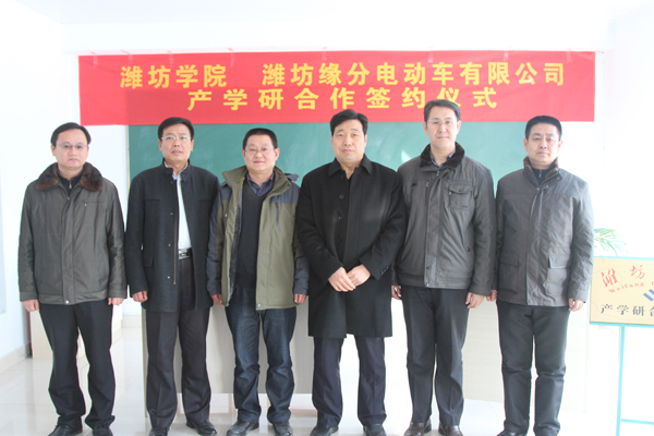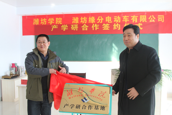 本站讯 12月27日,副院长王清明与潍坊缘分电动车有限公司就产学研合作进行签约,同时该公司作为我校的产学研合作基地揭牌。