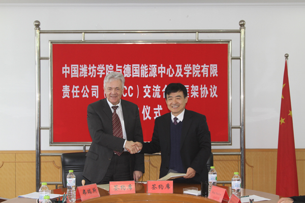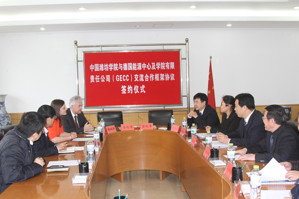 本站讯 2月27日,德国能源中心及学院有限责任公司首席执行长官弗瑞斯先生、中国区总经理燕妮可女士来校访问。院长王守伦、副院长王清明会见了客人。双方就有关合作事项进行了交流洽谈,并签署了《中国潍坊学院与德国能源中心及学院有限责任公司交流合作框架协议》。国际合作交流处、建筑工程学院负责同志参加了会谈。