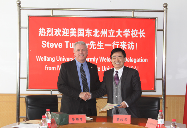 本站讯 3月13日,美国东北州立大学校长斯蒂夫·唐纳一行四人来校访问。院长王守伦、副院长王清明会见了客人。双方签署了《中国潍坊学院与美国东北州立大学学分互认协议》。