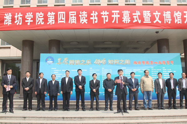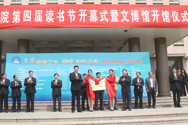 本站讯 4月23日,第四届读书开幕式暨文博馆开馆仪式举行。学校领导辛丕宏、王守伦、牛钟顺、冯滨鲁、赵光强以及潍坊市新华书店总经理王福林出席开幕式。部分图书、数字资源供应商,我校各部门负责同志和部分师生代表参加了开幕式。开幕式由副院长王清明主持。