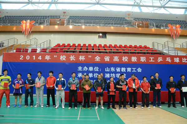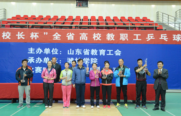 本站讯 5月9日,2014年全省高校“校长杯”乒乓球比赛在我校体育馆落下帷幕,山东省教育工会主席宋志明,潍坊学院院长王守伦、副院长冯滨鲁出席闭幕式并为获奖队颁奖。