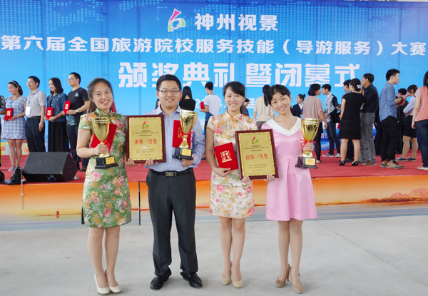 本站讯 近日,“神州视景杯”第六届全国旅游院校导游服务技能大赛结束,我校四名选手表现出色,获得三个一等奖和一个三等奖,2011级旅游管理专业胡凯帅、曲亚男同学荣获高等院校普通话讲解组一等奖;2011级旅游管理专业李甜同学荣获高等院校英语讲解组三等奖;2013级旅游管理专业周贝贝同学荣获高等院校英语讲解组一等奖。指导教师张凌云、卢飞、袁冬梅分别荣获一等奖优秀指导教师荣誉称号。学校同时荣获高等院校普通话组团体一等奖和英语组团体一等奖。国家旅游局副局长杜江为我校获奖选手颁发了奖杯。