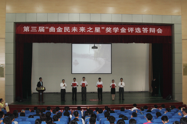 本站讯 6月5日,第三届“曲金民未来之星”奖学金评选答辩会在图书馆报告厅举行。学校领导王守伦、牛钟顺、王清明、马茜华获奖选手颁奖。