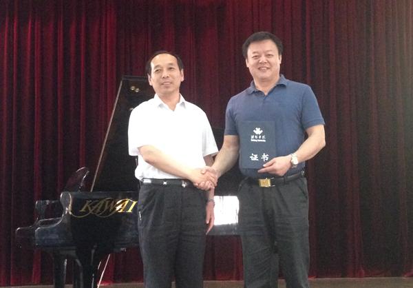 本站讯 6月11日,山东籍著名男高音歌唱家、国家一级演员周琦,受聘我校客座教授,副院长丁子信为其颁发聘书。