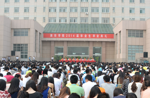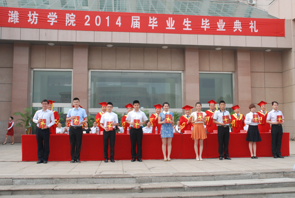 王守伦代表学校党委、行政和两万多名师生员工向顺利完成学业、即将走向社会的毕业生表示祝贺。他在讲话中回顾了2014届毕业生在大学阶段所取得的成绩,他说:“从入学到毕业,从青涩到沉稳,在短暂而充实的潍院岁月里,同学们懂得了如何学习,强化了品行修养,学会了适应转变、与人合作,更在彼此间建立了珍贵的友谊。这其间大家付出了很多,也收获了很多。在你们当中,有310人被评为省级毕业生先进个人,有274人被评为市级毕业生先进个人,有1054人次被评为校级毕业生先进个人;在你们当中,还有数百人次在“挑战杯”、机械创新设计大赛、网络商务创新应用大赛、电子设计大赛、数学建模竞赛、结构设计大赛等各级各类课外科技竞赛活动中取得了优异成绩,为学校争得了荣誉,我为你们所取得的优异成绩感到骄傲和自豪!”王守伦勉励毕业生们树立鸿鹄之志,与希望同行。无论在何种环境中,都要时时抬起头来,仰望星空,眺望远方,为自己加油鼓劲,勇敢地去追逐希望和梦想。要实现美丽的中国梦,需要整个民族众志成城、再接再厉;要实现个人梦想,更需要自信坚定、奋斗拼搏,勇敢地“到中流击水”,在把握机会中展现才华,在争取胜利中释放激情。坚持脚踏实地,与勤劳同行。无论在什么岗位上,都要扑下身子,从小事做起,从基层做起,虚心向长辈请教、向同事学习,用坚韧不拔、勤劳实干赢得周围人的认可。要勤学不辍,与时俱进,不断历练,凭着勤劳的双手积极钻研,积累经验,要敢于承担重任,善于求是创新,力争做社会可靠的脊梁,做时代前进的先锋!做生活强者,与智慧同行。要保持一份清醒和韧劲,保持一份超脱和泰然,做到达不失义,穷不离道,胸襟坦荡,笑对人生;永远保持青年人的朝气和活力,不断丰富精神世界,用正能量武装自己,用善良和宽容感化他人,用智慧和勇敢实现人生的价值。他希望同学们言青春之志,力青年之行,勇担青年的光荣使命,给国家与社会带去青春的力量。