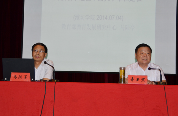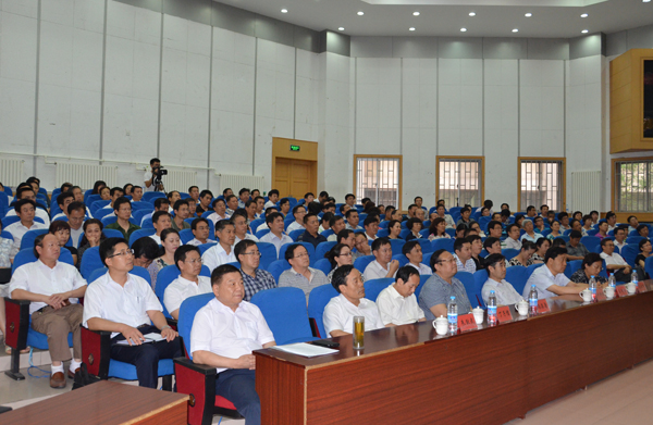 本站讯 7月4日,我校举行党委中心组集体学习报告会,邀请教育部国家教育发展研究中心高等教育研究室马陆亭主任,以《高教改革进程中的大学章程建设》为题作了一场精彩生动的报告。报告会由党委书记辛丕宏主持,学校领导牛钟顺,冯滨鲁、王清明、丁子信、马茜华、朱猷武出席活动。全体处级干部、正高级职称人员、市级以上党代表、人大代表、政协委员、民主党派负责人、二级学院两办主任、管理、教辅部门正科级干部参加了报告会。