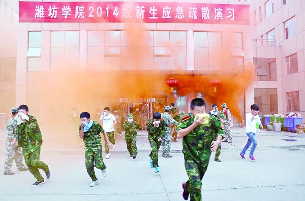 这次应急疏散演习由校纪委书记马茜华任总指挥,新生军训团团长杨西法、潍坊市消防支队参谋长吴永康、保卫处、学工部、弘德书院、北海国际学院、歌尔科技学院的负责同志同时在演习主席台观摩整场演习。新生军训团共约5400余人参加了此次演习。(陈鼎立)