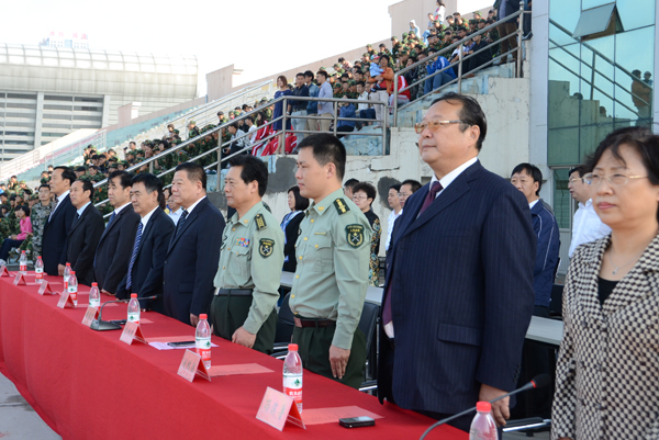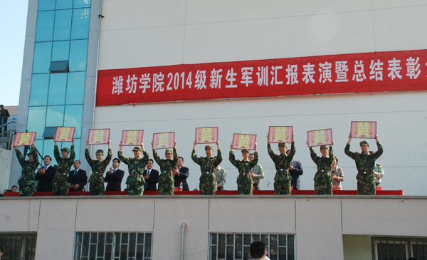 本站讯 9月29日,我校2014级学生军训汇报表演暨总结表彰大会在学校体育场隆重举行。潍坊军分区政治部主任李树春大校,高新区人武部相关负责人,学校领导辛丕宏、王守伦、牛钟顺、冯滨鲁、丁子信、马茜华、朱猷武出席大会。学校各单位、各部门主要负责同志参加了活动。大会由纪委书记马茜华主持。