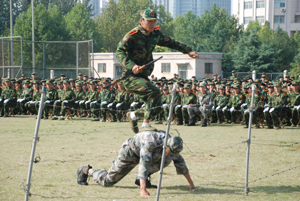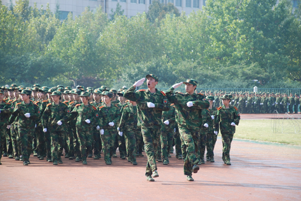 在奏唱庄严的国歌后,军训汇报表演正式拉开序幕。由5800名新生组成的51个方队迈着整齐的步伐,喊着铿锵的口号,进行了分列式表演,接受与会领导的检阅。之后还进行了精彩的内务表演、军体拳表演、单兵战术基础动作表演、正规化动作表演。