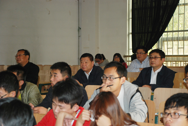 仪式前,辛丕宏、冯滨鲁、孙红斌、蒋洪寨在教务处、歌尔科技学院、歌尔声学股份有限公司相关负责同志的陪同下,到歌尔科技学院听取了歌尔集团讲师王发俭为2012级机械制造及自动化专业讲授的《企业应用实例》之《注塑模具结构》。《企业应用实例》这门课程全部由歌尔声学股份有限公司的工程师承担,分模块讲授。