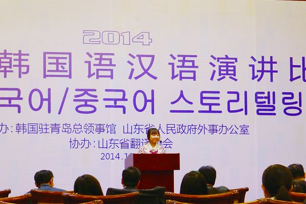 本站讯 10月30日,我校两名朝鲜语系的中国学生和来自韩国的两名留学生组队参加了由山东省人民政府外事办公室、韩国驻青岛总领事馆主办的“山东省韩国语、汉语演讲比赛”。朝鲜语系的侯菲菲同学以精彩风趣的韩国语演讲征服全场获得冠军。