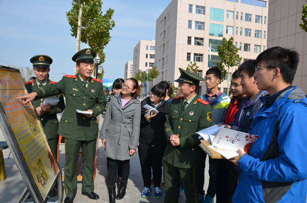 本站讯 2014年全国消防宣传日来临之际,11月7日,我校联合潍坊市消防支队,潍坊市地震局,高新区公安分局网络安全保卫大队、交通警察大队,在学校弘德书院和第二餐厅广场对师生进行防震常识、消防安全常识、网络防诈骗常识、交通安全常识、防邪教常识等宣传,现场发放各类宣传材料16000余份。