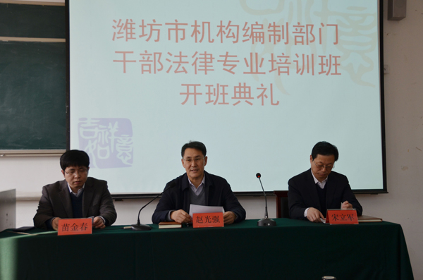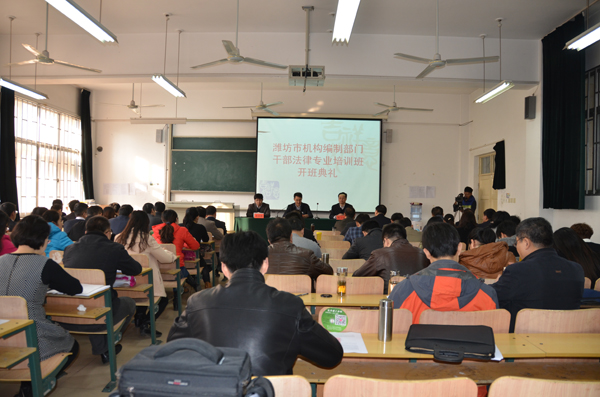 本站讯 11月20日,潍坊市机构编制系统干部法律专业培训班开班仪式在我校举行。副院长赵光强,潍坊市委组织部副部长、市编办主任宋立军在仪式上讲话。仪式由法学院负责同志主持。科研处负责同志、首批参加培训的近80名学员参加了仪式。