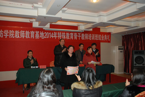 本期培训采取集中培训和分散研修相结合的培训模式,集中培训10天,分散研修两个月。教师教育基地根据在职教师学习的特点,在集中培训期间,以问题为中心,以案例为载体,综合运用讲座式、参与式、案例式、模拟式、体验式、观摩式等教学方法,引导、鼓励受训者积极参与社会调查、实践锻炼和教育研究,促进教师在理论与实践能力上的提高。青州特校的刘秀娟说:“学校聘请了国内著名专家教授和潍坊市的名师、名校长构成的专家团队为我们授课,配备了得力的班主任,教学方法也灵活多样,我们通过这次培训,确实提高了专业技能,感觉收获很大。”