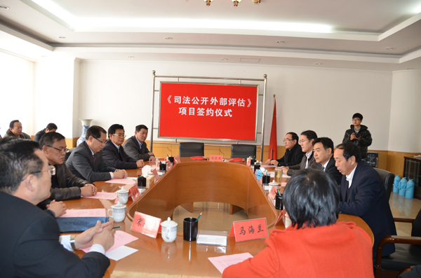 本站讯 12月23日,我校与潍坊市中级人民法院《司法公开外部评估》合作项目签约仪式举行。院长王守伦与市中级人民法院党组书记、院长姜树政代表双方在项目书上签字。副院长丁子信、姜树政在仪式上讲话。仪式由副院长赵光强主持。党委书记孙文亮会见了姜树政一行。