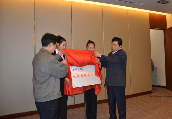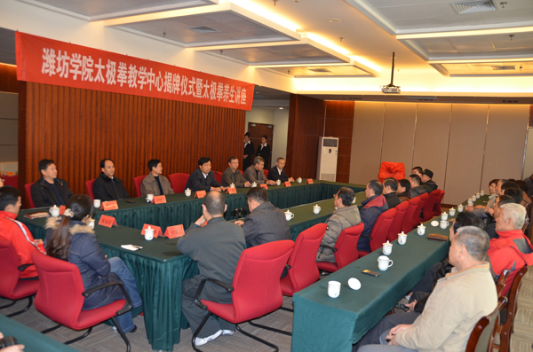 本站讯 12月30日,学校太极拳教学中心揭牌仪式暨太极拳养生知识讲座在体育馆会议室举行。副院长王清明与潍坊市武术协会主席赵青在仪式上致辞,并为教学中心揭牌。仪式由体育馆管理服务中心负责同志主持。