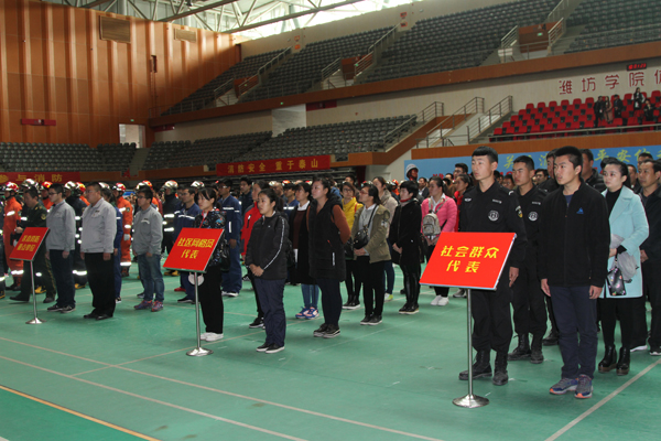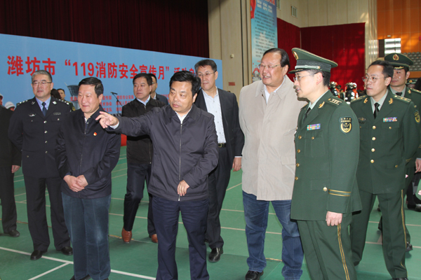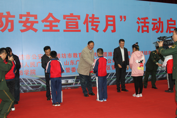 本网讯 11月9日,潍坊市2017年“119消防安全宣传月”活动启动仪式在我校举行。潍坊市副市长、市公安局党委书记、局长吴磊,校长冯滨鲁,副校长赵光强出席启动仪式。市委宣传部、市消防大队、团市委、市教育局、邮政管理局等领导以及消防志愿者代表、社会各界群众和新闻媒体记者参加了启动仪式。