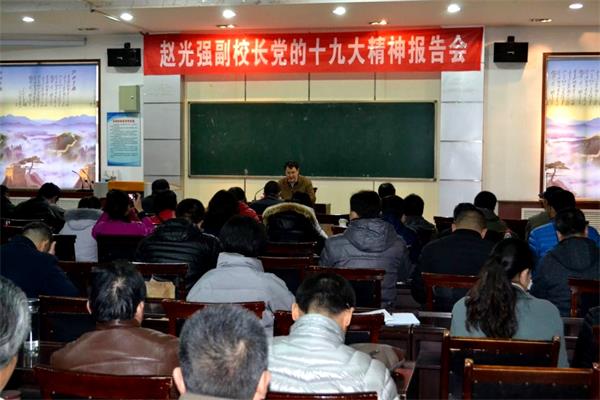 赵光强从深刻领会十九大报告精神和深入学习贯彻党的十九大精神、扎扎实实做好本职工作两个方面,对十九大报告精神进行解读,并就如何在本职工作中贯彻十九大精神提出要求。赵光强分析了党的十九大重要意义和历史使命,并从过去5年取得的历史性成就和我国社会主要矛盾变化、四个自信和反腐倡廉等方面对十九大精神进行了系统、全面、深入的讲解。他对参加报告会的各单位工作进行了点评,要求大家明白肩上的责任和使命,在应对“本领恐慌”中增强自身素质,做好本职工作,实现自己的理想,为学校发展贡献力量。