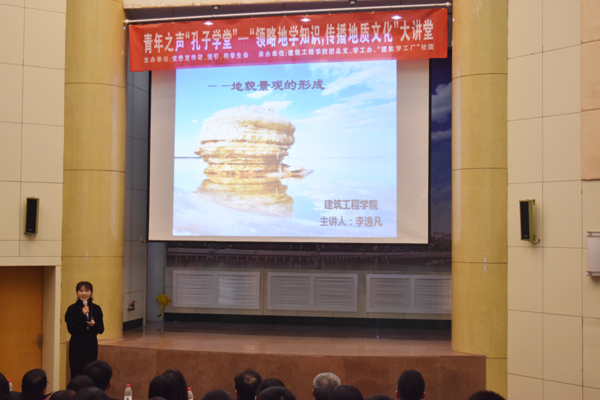 主讲老师李逸凡通过地貌景观、地质作用及其分类、剖析形成原因三个方面介绍了工程地质在建筑方面的应用,通过一幅幅风光旖旎的图片带领大家领略了祖国的秀丽山水,感受了地貌景观的千姿百态。本次讲堂带领同学们领略了地学知识,传播了地质文化,提高了同学们的爱国情怀及文化素养。至此,建工学院承办的2017年孔子学堂——“传播国学文化·领略建筑魅力”系列活动结束。