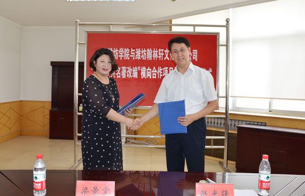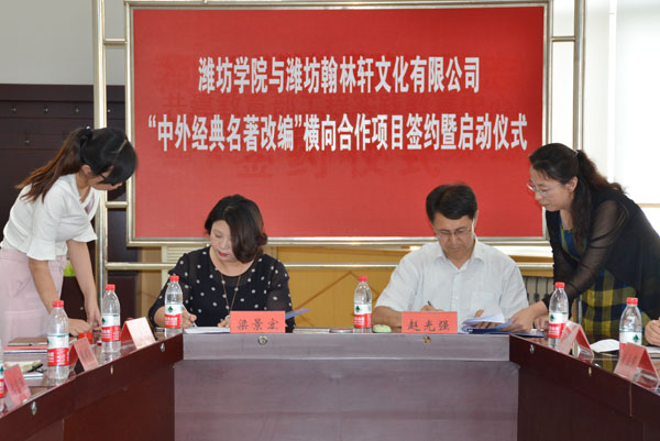 根据协议约定,我校文学与新闻传播学院与潍坊翰林轩文化有限公司将合作进行以中小学生为主要读者的39本中外经典名著的改编工作。
