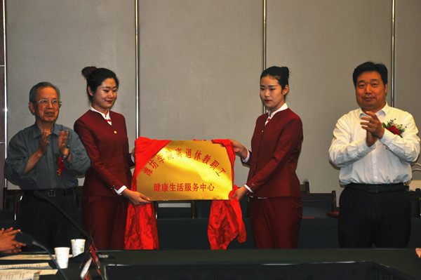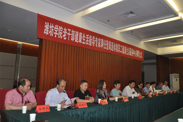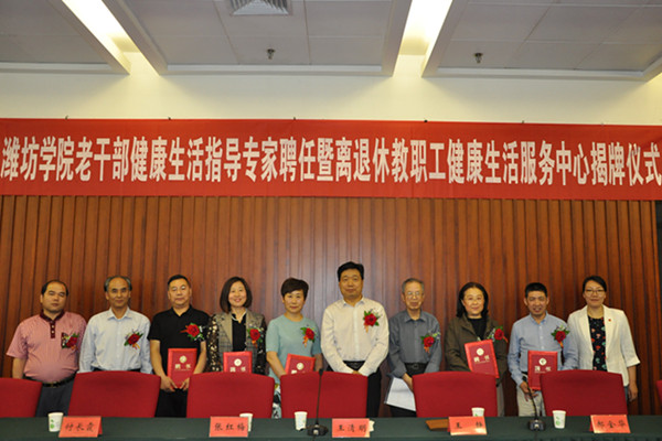 本网讯 5月21日下午,潍坊学院老干部健康生活指导专家聘任及离退休教职工健康生活服务中心揭牌仪式在学院体育馆会议室举行。校党委副书记王清明为服务中心揭牌,同时为来自潍医附属医院、潍坊市直机关医院等单位6名专家颁发了聘书并讲话。离退休工作处负责人主持仪式。学校团委负责人及部分大学生志愿者和离退休教职工老党员40余人参加了活动。