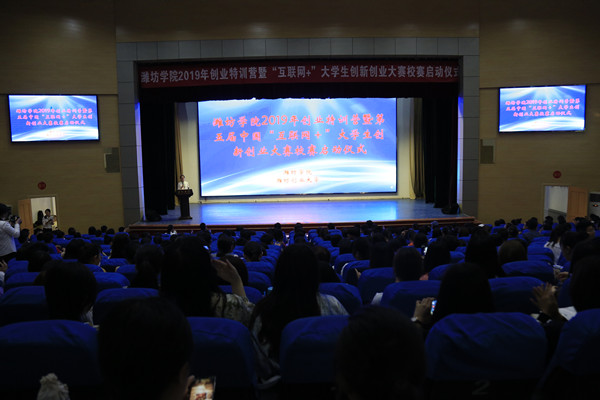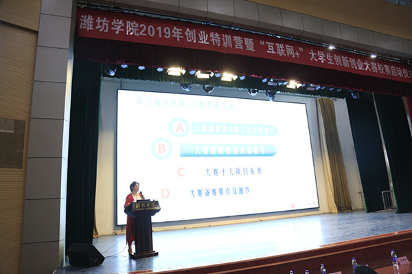 本网讯 5月24日上午,潍坊学院2019年创业特训营暨第五届中国“互联网+”大学生创新创业大赛校赛启动仪式在图书馆报告厅举行。学校党委副书记王清明、潍坊创业大学副校长苏媛媛、山东拓维企业管理咨询有限公司董事长沈福萍出席仪式,学生工作处负责同志参加了仪式。