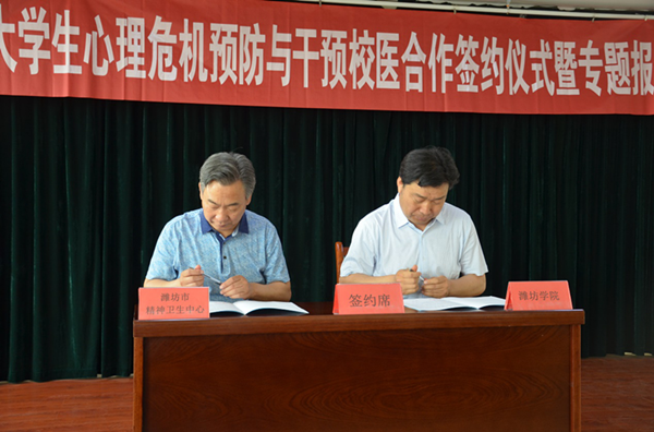 签约仪式上,王清明和葛茂宏分别代表双方签署了《大学生心理危机预防与干预校医合作协议书》。根据协议,潍坊市精神卫生中心将为我校专兼职心理教师及辅导员担任心理健康保健和精神卫生工作顾问,为大学生心理危机个案开通心理危机诊疗-干预-转介绿色通道,定期进校园开展心理健康宣传活动等。我校将充分利用有利条件,为潍坊市精神卫生中心开展大学生心理健康服务项目提供帮助和支持等。
