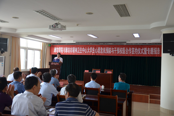 本网讯 5月24日下午,潍坊学院与潍坊市精神卫生中心大学生心理危机预防与干预校医合作签约仪式在我校举行。我校党委副书记王清明、潍坊市精神卫生中心党委书记葛茂宏,副院长张传波、主治医师孟亮亮等领导和专家出席签约仪式。各二级学院党总支副书记、学生工作负责同志、负责学生心理健康教育的辅导员老师参加了仪式。仪式由学生工作处负责同志主持。