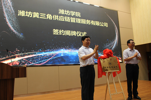 本网讯 5月29日,我校与潍坊黄三角供应链管理服务有限公司校企合作共建教学实践基地签约暨揭牌仪式在峡山区举行,潍坊学院党委副书记王清明、峡山区党工委书记李华刚为基地揭牌,出席签约仪式的还有峡山区相关部门领导以及经济管理学院的负责同志。