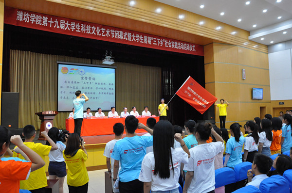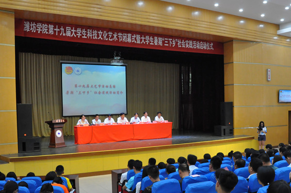 本网讯 6月26日,潍坊学院第十九届大学生科技文化艺术节闭幕式暨大学生暑期“三下乡”社会实践启动仪式在学校闻韶楼报告厅举行。学校党委副书记王清明出席仪式。办公室、宣传部、学生工作处、科研处、工会负责同志在主席台就坐,仪式由团委负责同志主持。各学院分管学生工作负责人、团总支书记(副书记)、受表彰人员、社会实践志愿者代表参加仪式。