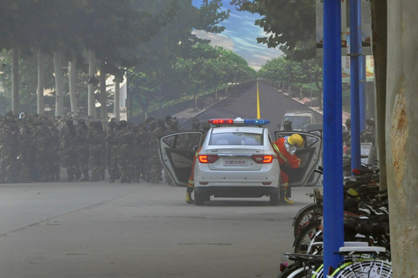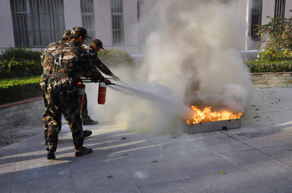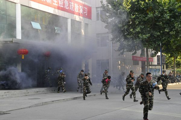 16时30分,各项工作准备就绪,王清明宣布演习开始。十一号公寓楼内外顿时浓烟滚滚,一名同学冲出房间,到公寓值班室报告发生火灾的具体位置。公寓值班员接到报警后立即启动了应急疏散预案,分为三个小组迅速开展工作。灭火行动组利用公寓内的消防器材,到火灾现场进行灭火救援。通讯联络组立即拨打119和校园110的报警电话。引导疏散组切断了十一号公寓的主电源,开启了所有的疏散通道,引导人员疏散。被困同学陆续、有序的按照应急疏散预案的要求向安全区域疏散。校园110服务中心的工作人员接到报警后,作为救援的第二梯队,携带灭火器,迅速赶到现场,进行灭火救援和人员疏散。随后,新生进行了灭火实战技能汇报表演。
