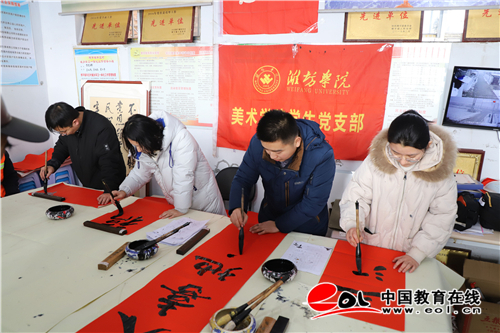 中国教育在线讯 农历庚子年来临之际,伴随着冬雪,沐浴着冬韵,1月7日至9日,潍坊学院美术学院学生党支部组织师生党员一行9人赴聊城市茌平区对接学校驻村第一书记,开展“翰墨清风书写乡村振兴 守正初心助力全面小康”主题活动,写春联迎新春,送文化助脱贫。