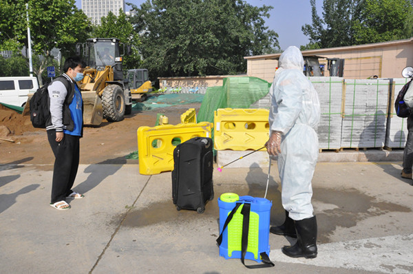 在校门口入口处对返校学生所带行李进行消毒,实施“一测二核三查四通过”,测量体温、核验身份(身份证、学生卡)、查验健康码,符合条件的学生方可通过,各环节分工明确,顺畅有序。
