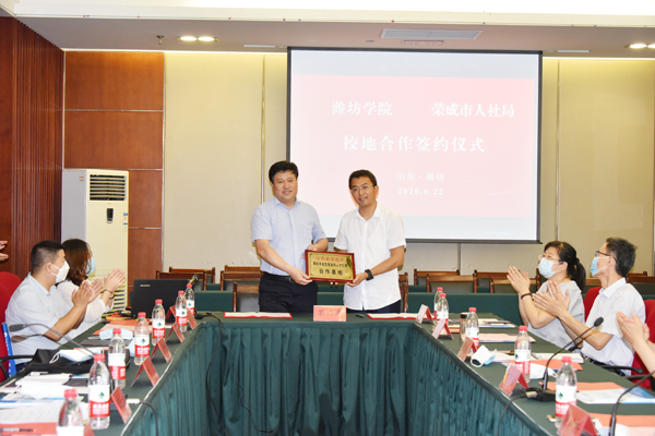 本网讯 6月22日,潍坊学院与荣成市校地合作座谈会暨签约仪式在潍坊学院举行。荣成市委组织部副部长、人社局局长王立新,副校长丁子信出席仪式并致辞。