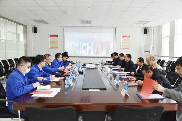 本网讯 4月16日,为深化校企合作,加快推进产业学院建设,学校党委书记李东、副校长丁子信带领相关部门和单位负责同志,到潍柴职业大学考察座谈。潍柴控股集团党委副书记、潍柴职业大学校长马常海,副校长刘洪勇陪同参观并参加座谈交流。